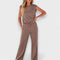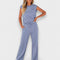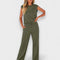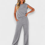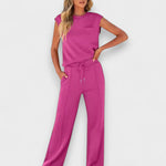 This two-piece set in black combines a sleeveless top with a front pocket and straight-cut pants with an adjustable elastic waistband. Perfect for those seeking comfort without sacrificing style, ideal for both everyday wear and casual occasions.